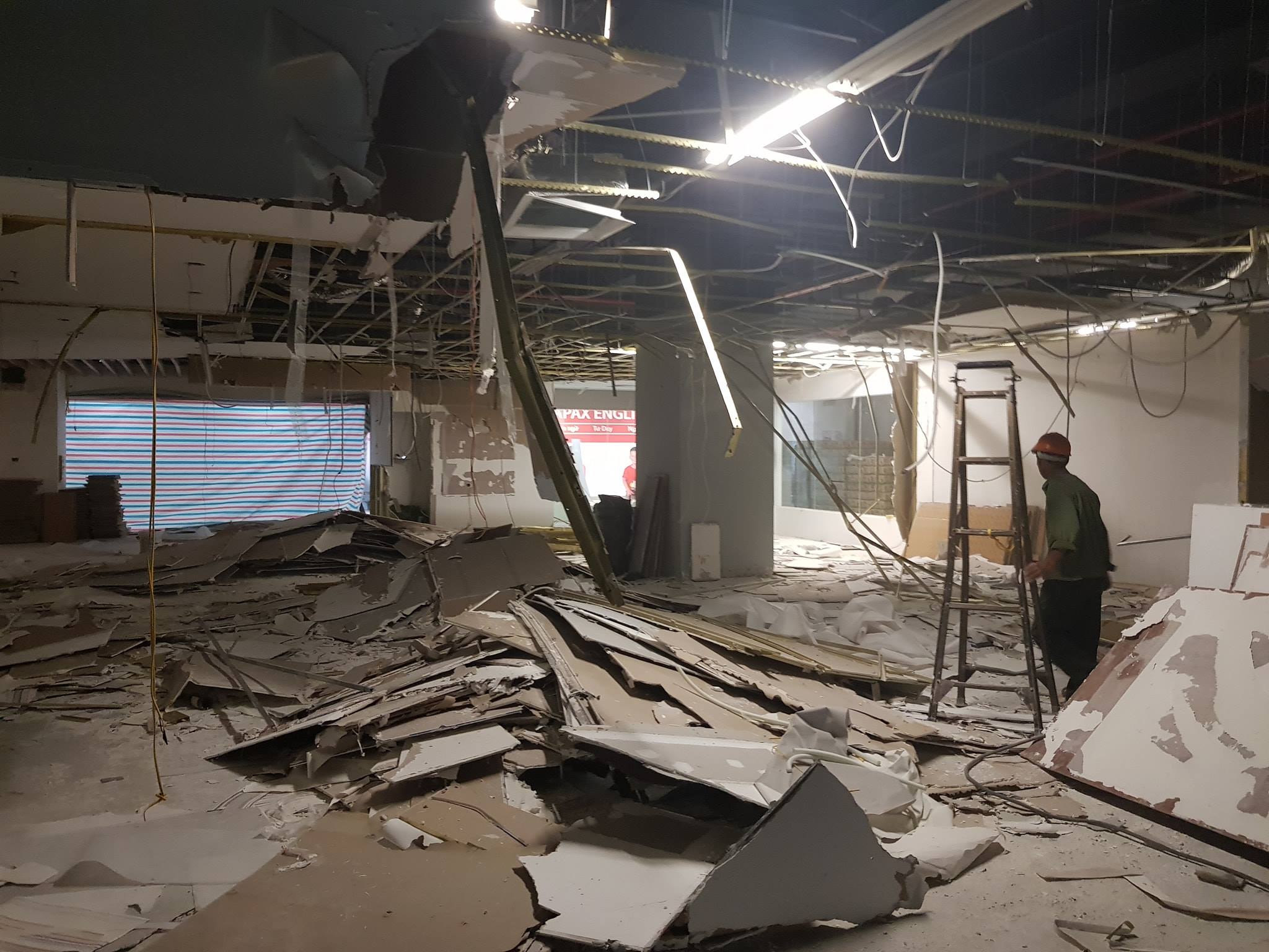 3. Ngắt điện & Hệ thống kỹ thuật: Đảm bảo an toàn bằng cách ngắt điện các thiết bị đèn, điều hòa, báo cháy trên trần trước khi hạ sàn.