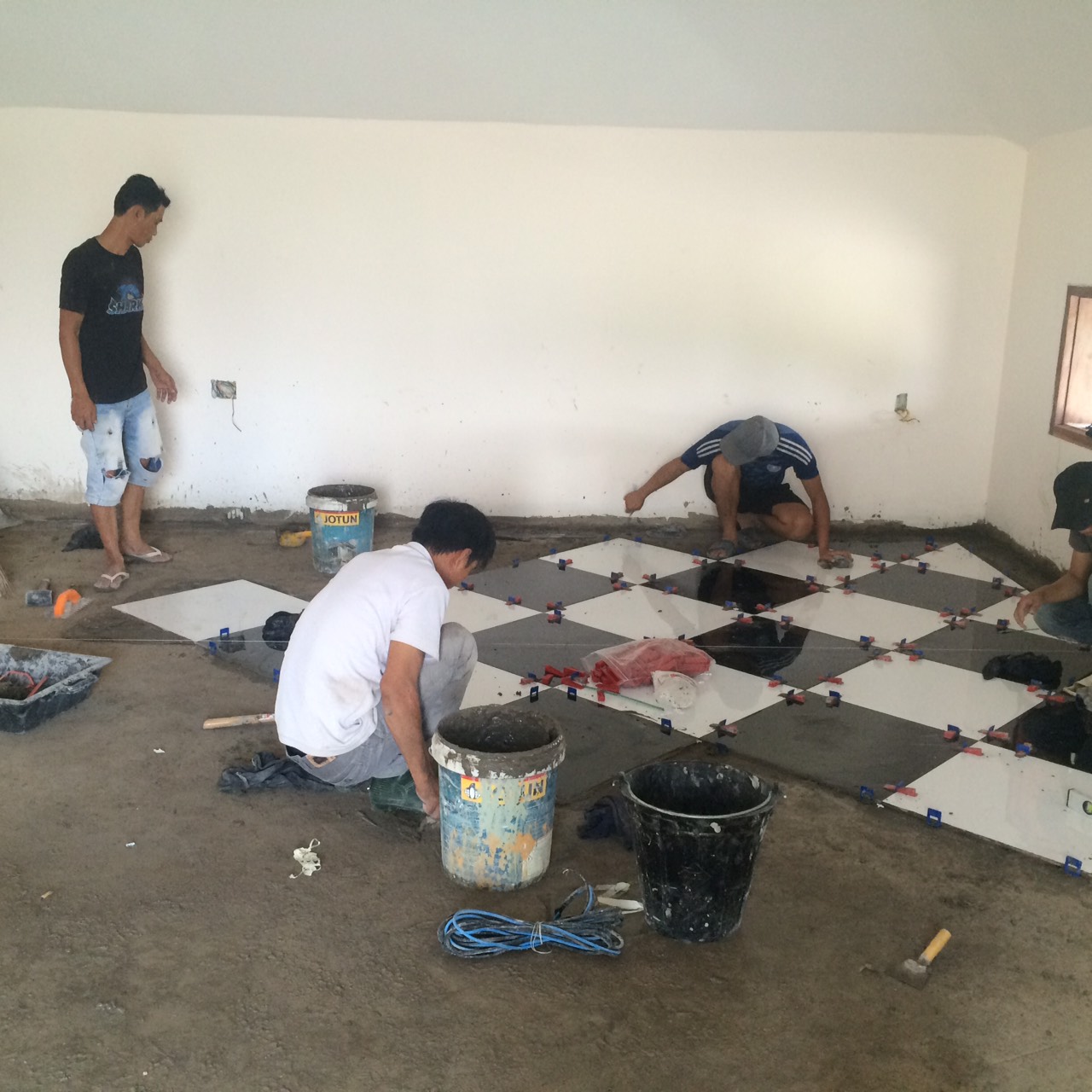 - Thi công ốp lát: Tiến hành ốp/lát gạch theo mẫu, sử dụng ke cân bằng để đảm bảo phẳng tuyệt đối.
