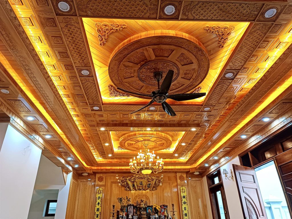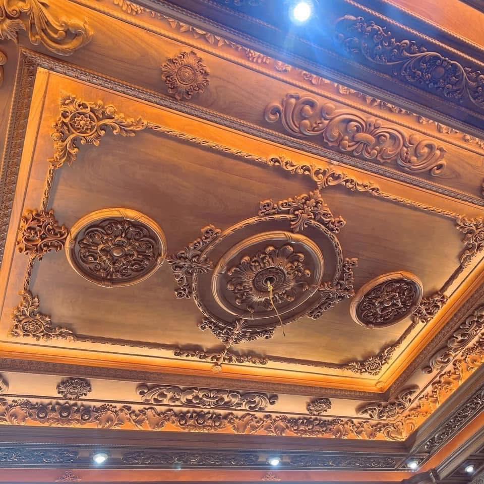• Trần gỗ tự nhiên: Vật liệu chính được sử dụng là gỗ thật (như gỗ Gõ Đỏ, gỗ Hương, gỗ Pơ Mu, v.v.). Gỗ tự nhiên mang lại vẻ đẹp độc đáo, sang trọng và có giá trị thẩm mỹ cao.