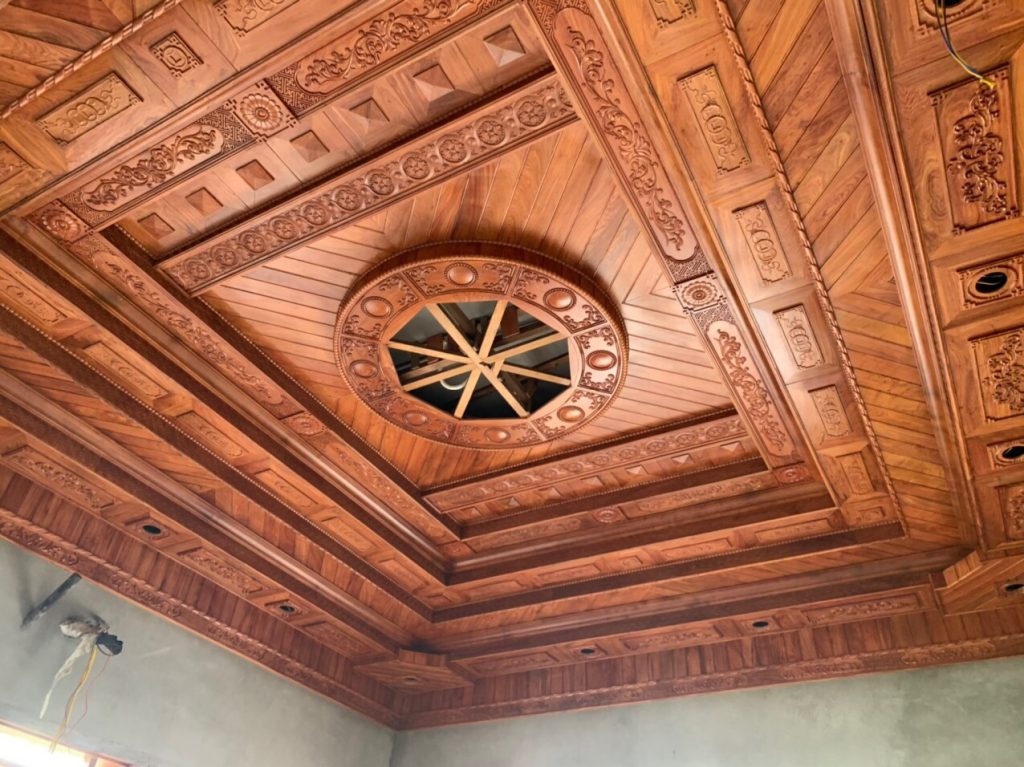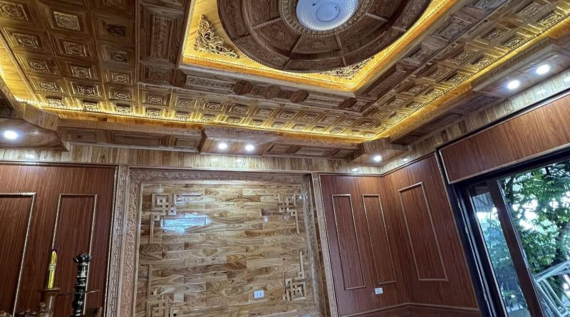 • Trần gỗ tự nhiên (Giáng hương, Gõ đỏ, Pơ mu): Phổ biến ở không gian phòng khách, biệt thự, nhà cổ điển, tạo vẻ sang trọng.