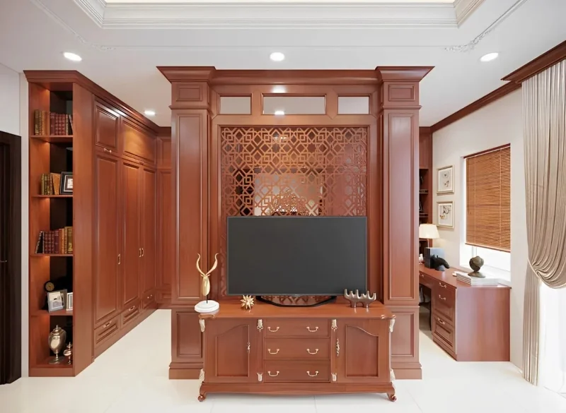 - Tích hợp chức năng: Kết hợp vách ngăn với kệ tivi, kệ sách, tủ rượu để tiết kiệm diện tích và tăng tính tiện nghi.