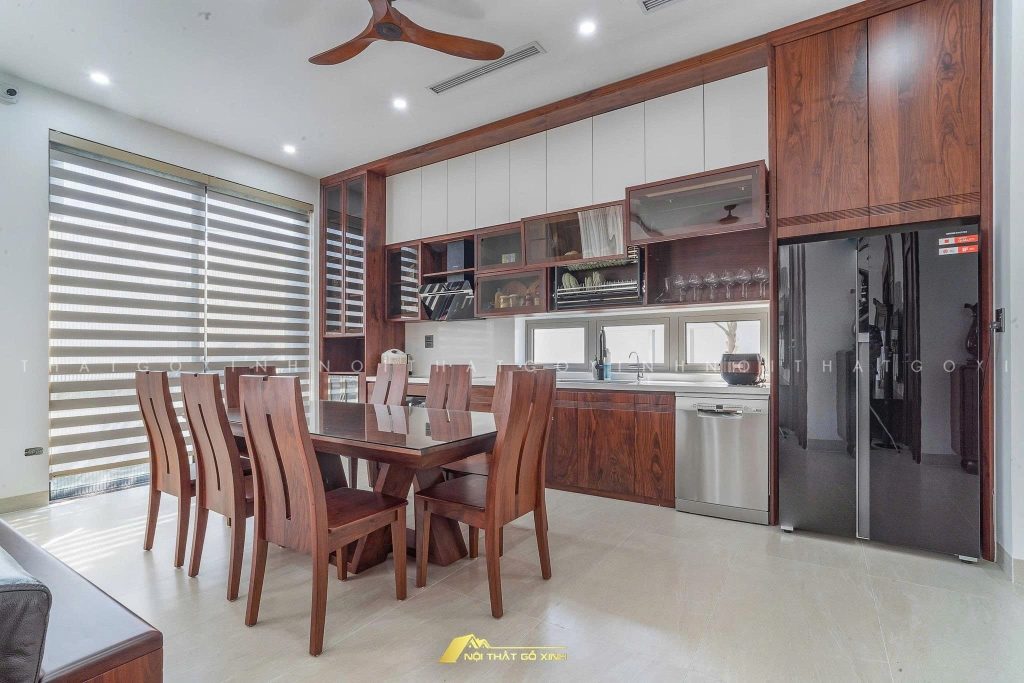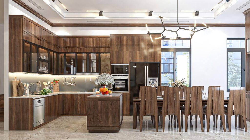 Tủ bếp, bàn đảo:Các sản phẩm tủ bếp và bàn đảo bằng gỗ óc chó giúp hoàn thiện không gian bếp.