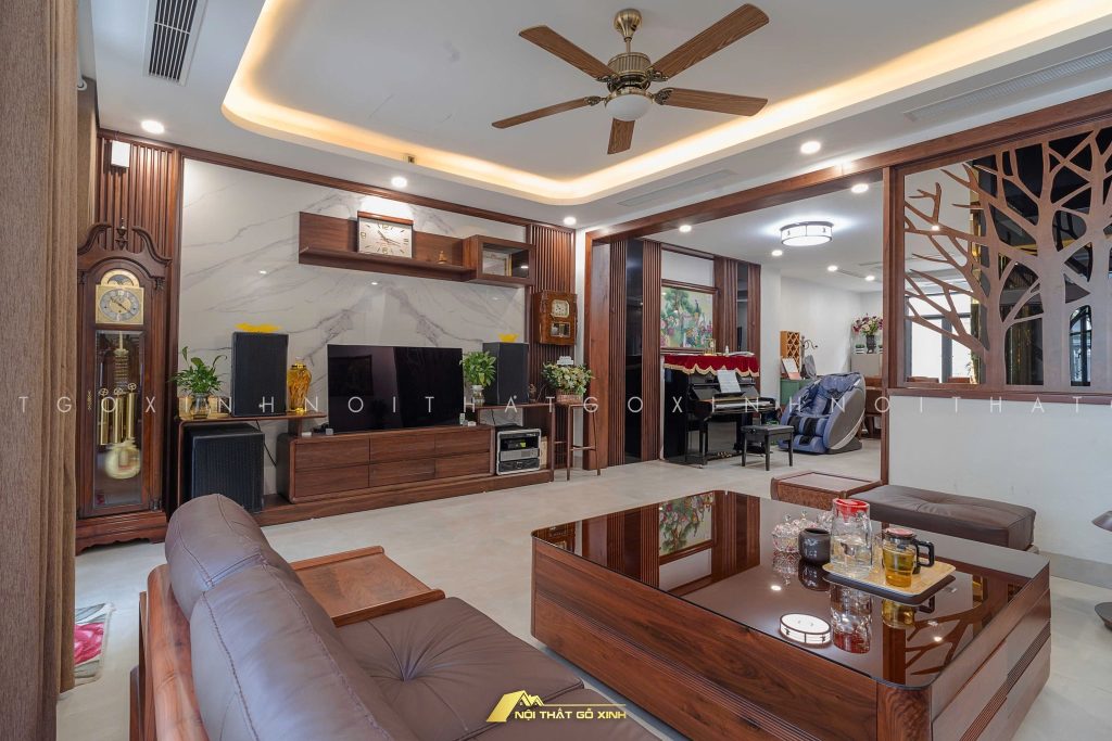 Bàn ghế Sofa:Bộ bàn ghế sofa gỗ óc chó là món đồ nội thất trung tâm của phòng khách.