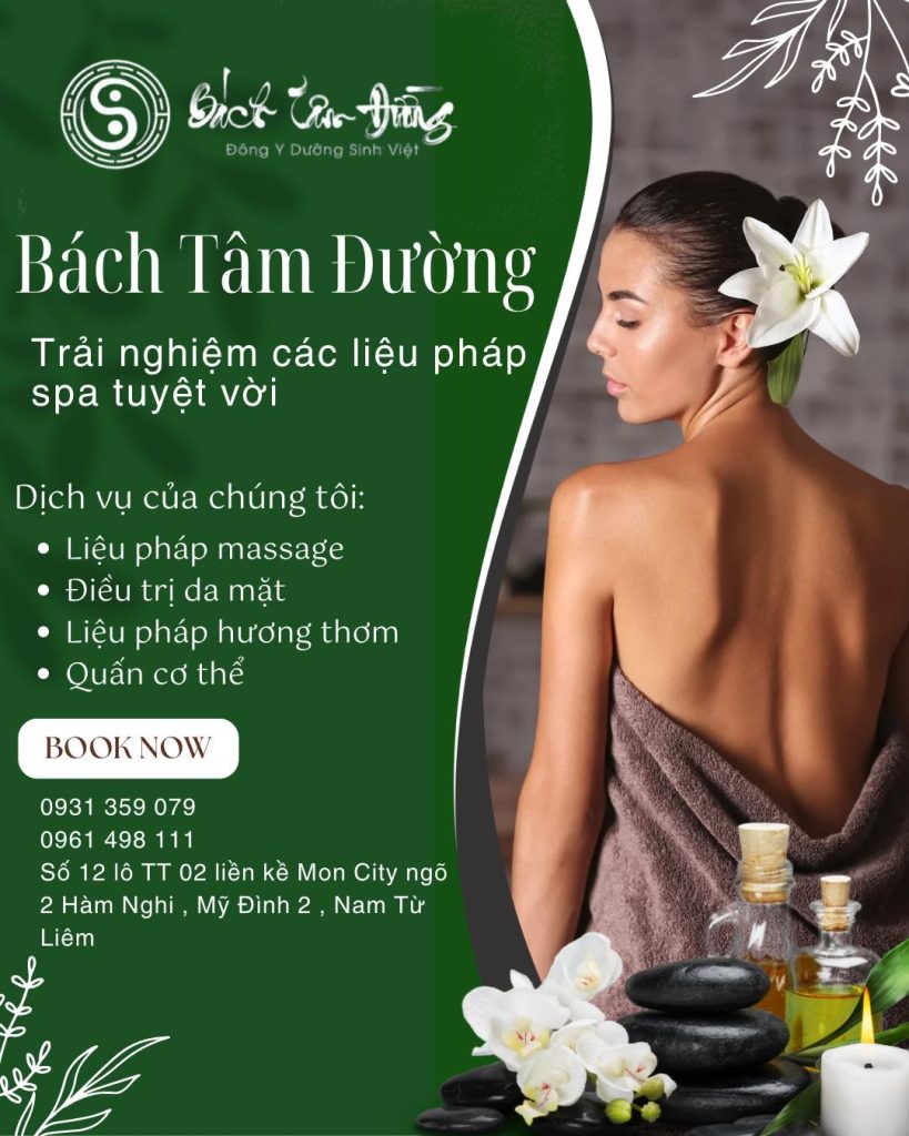 Spa Bách Tâm Đường Số 12 lô TT 02 liền kề Mon City , ngõ 2 Hàm Nghi , Mỹ Đình 2 , Nam Từ Liêm Liên Hệ Zalo 0931359079