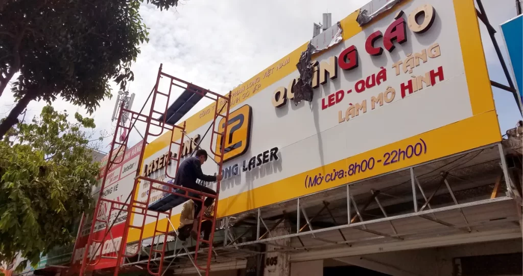 - Độ khó thi công: Vị trí lắp đặt cao, khó tiếp cận, hoặc yêu cầu kỹ thuật đặc biệt (biển chữ nổi 3D, hộp đèn không viền) sẽ tăng chi phí nhân công.